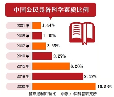 据北京市科协常务副主席司马红介绍,第十一次中国公民科学素质抽样调查结果显示,2020年北京市公民具备科学素质的比例达到24.07%,位于创新型国家的较高水平,接近科技强国水平。相比“十二五”末的17.56%,增幅6.51%,增幅居全国首位。