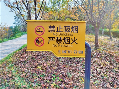 2021年11月2日,湖北宜昌城东公园,园内多处设有写着“禁止吸烟 严禁烟火”的指示牌。图/IC photo