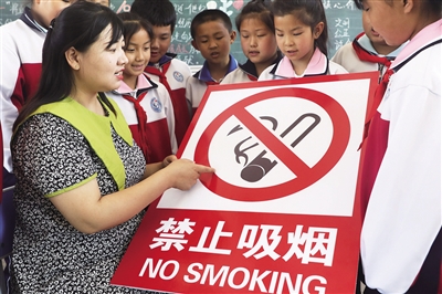 2021年5月28日,河北省唐山市杨家铺小学,老师教学生认识禁烟标志、宣讲吸烟的危害。图/IC photo