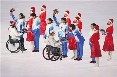 场地内晶莹闪烁,由残疾人和健全人组成的志愿者代表走上舞台,现场用经久不息的掌声,表达着对9000余名冬残奥会志愿者的由衷谢意。