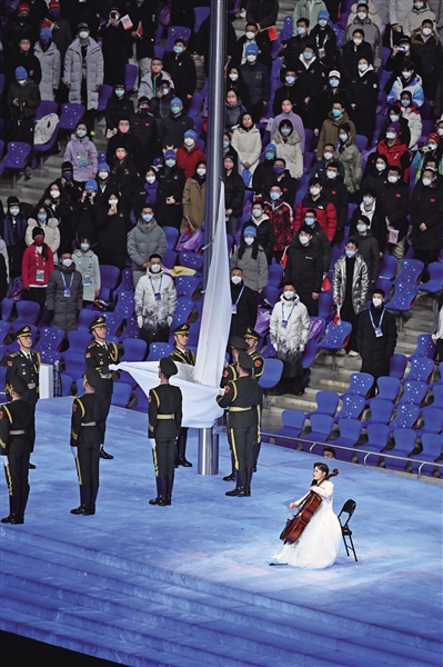 肢体残疾人乐手用大提琴奏响国际残奥委会会歌,会旗在全场观众深情注视中缓缓下降。