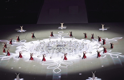 随着“雪花凳”的移动,90位“雪花姑娘”在柔美的音乐里翩翩起舞……开幕式上,百余名演员合作完成了当天唯一的文艺表演节目《冬残奥圆舞曲》。