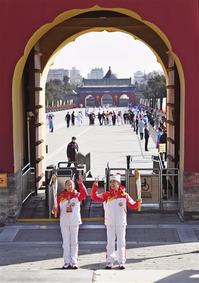 3月2日,天坛公园祈年门,第4棒火炬手杨建中(左)和第5棒火炬手齐文升完成火炬传递后合影。