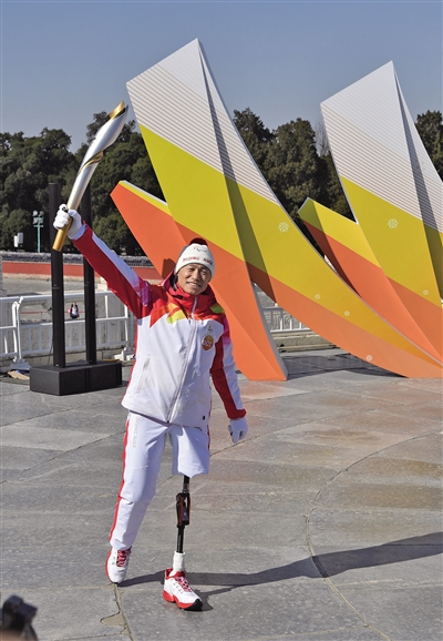 无论是在赛场上,还是在生活中,我们都要展示中国人的精神,努力表现得更精彩。未来,不管我们在哪个行业,都要永不放弃,永远向上。——火炬手侯斌新京报记者 李木易 摄