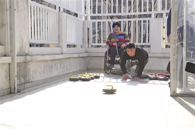 2月24日,朝阳区花家地南里8号楼,望京街道温馨家园,冰壶俱乐部成员正在进行日常训练。 本版摄影/新京报记者 王飞