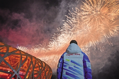 2月20日,北京冬奥会闭幕式燃放烟花,一位志愿者在“鸟巢”外值守。图/IC photo