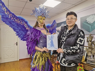 1月29日,在自贡一间设在酒店中的办公室里,新京报记者见到了“精卫女神”背后的设计者李微微。他的日常起居都在这间二三十平方米的空间里,办公桌上叠放着各种手稿草图,包括勾勒的“精卫女神”的服装初稿。