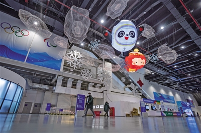 1月27日,北京冬奥会主媒体中心,大厅上悬挂自贡造的“冰墩墩”和“雪容融”彩灯。新京报记者 陶冉 摄