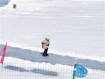 2月15日中午,张家口一个孩子在户外的天然冰场滑冰。