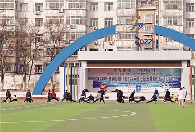 2月10日下午,宣化二中的操场上,教练正带领运动员们进行体能训练前的热身活动。新京报记者 咸运祯 摄