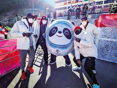 布朗和其他特立尼达和多巴哥冬奥代表团成员与冰墩墩合照。受访者供图