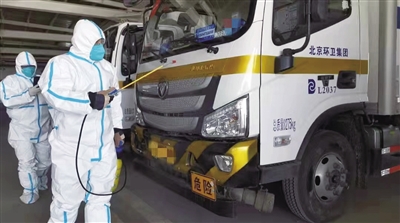 发车前,清运人员对车辆进行消杀作业。李瑞波 摄