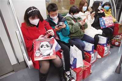 2月4日,北京地铁8号线,市民带着购买的“冰墩墩”玩偶搭乘地铁回家。新京报记者 郑新洽 摄