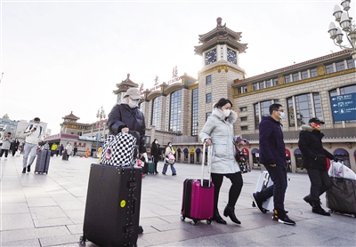 2月6日,春节假期的最后一天,高速公路、火车站迎来返程高峰。图为抵达北京站的旅客,走进站前广场准备乘坐地铁。新京报记者 王贵彬 摄