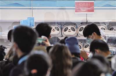 2月5日,主媒体中心,排队购买“冰墩墩”的人群。