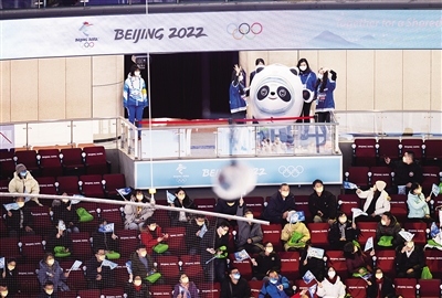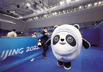 2月2日,冰立方,比赛开始前,“冰墩墩”吸引了一位记者的镜头。