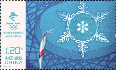 邮票整体主要采用白、蓝两色,突出冰雪盛会概念。邮票画面将冬奥会开幕式丰富、动感的视听语言转化为平面语言,通过对三维空间及时间跨度的解构与重组,在二维平面中呈现冬奥会开幕式的经典元素,体现了瞬间即永恒的设计理念。整体画面简约、精致,呈现出空灵、雅致、现代的设计感,契合本届冬奥会开幕式理念。