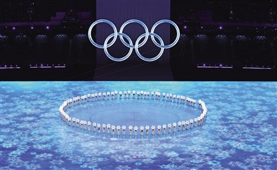 在北京冬奥会《构建一朵雪花》环节中,引导员们手持雪花形成的引导牌向场地内围拢,飘落的小雪花也开始向场地汇聚。接着,一条橄榄枝把一个个书写着参赛国家和地区名字的“小雪花”共同汇聚在冰雪五环下,组成了一朵硕大的雪花,构成一个雪花台。