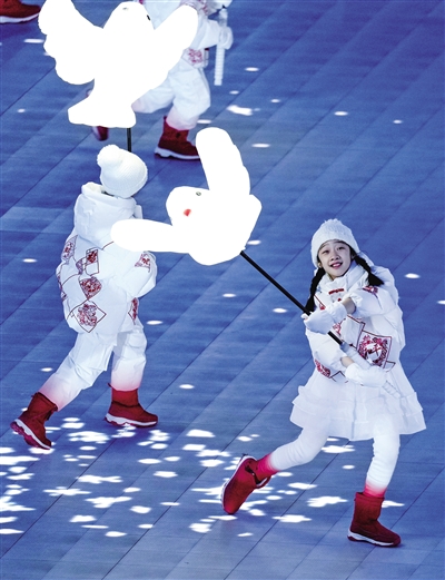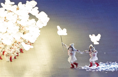 在“放飞和平鸽”和演唱主题歌《雪花》环节上,数百名小朋友手持和平鸽模型,在场内自由愉快地奔跑,与脚下晶莹闪亮的“星星雪花”嬉戏互动。