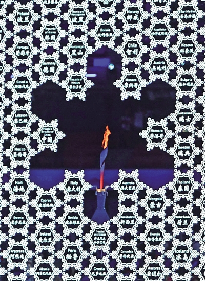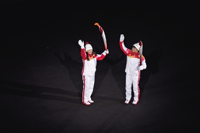两位“00”后运动员将手中的火炬插在“大雪花”火炬台中央,雪花般圣洁灵动的火苗代替了熊熊燃烧的火焰,再次书写了奥林匹克历史崭新的一页。