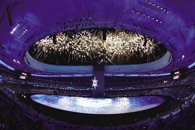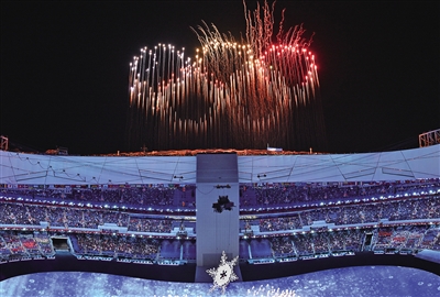 音乐声中,空中“雪花”飘。花火照亮璀璨星河,世界同庆奥林匹克。据新华社
