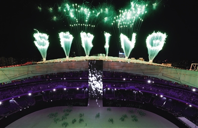 开幕式尾声,伴着优美的音乐,“雪花”形状焰火绽放空中,随后巨大的五环焰火升空,“冰花”“雪花”竞相绽放。