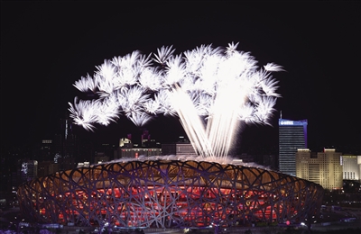鸟巢上空火树银花。中国人正用自己的方式表达对全世界来宾的欢迎。