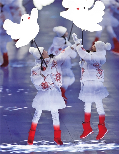 在《雪花》环节,小演员们双手举着“和平鸽”,随着脚步的移动,脚下“盛开”一朵朵晶莹洁白的雪花。