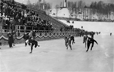 1932年普莱西德湖冬季奥运会,滑冰运动员正在比赛中。