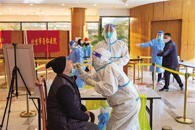 北京新闻中心的核酸检测点为媒体人员提供核酸采样服务。