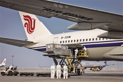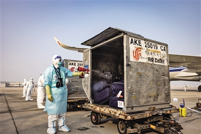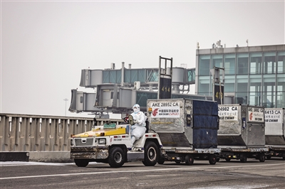 1月25日,首都国际机场T3D入境保障专区,CA994意大利米兰-北京航班落地后,国航地服行李操作人员正在后货舱装卸航空集装器。