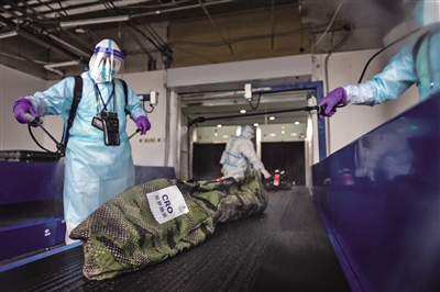 中检工作人员正在对奥运行李进行第二次消杀。