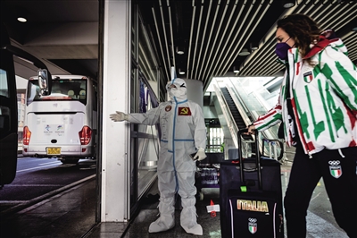 国航地服工作人员正在指引意大利运动员有序登车。A06-A07版摄影/新京报记者 陶冉 通讯员 汪洋