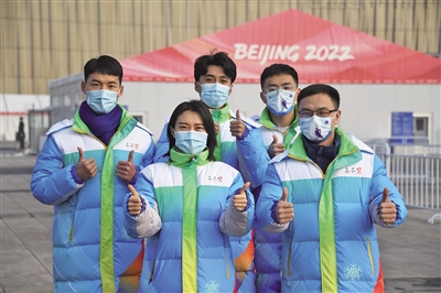 昨日,城市志愿者代表在五棵松体育中心附近合影。新华社记者 任超 摄