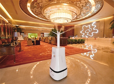 1月19日,日坛宾馆,防疫机器人在宾馆大厅进行消杀作业。新京报记者 王贵彬 摄