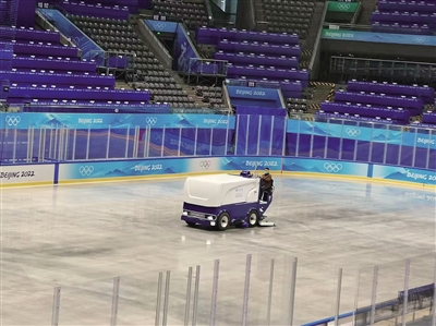 按照制冰流程,要先对竞赛场馆FOP区混凝土表层进行降温,降到-8℃时,才可以用浇冰车进行底冰浇筑。1月11日上午,浇冰车驶进竞赛场馆进行底冰浇筑作业。十多分钟停歇下来,等冰面凝结定型之后,继续巩固浇筑,直至底冰浇筑大约保持在1厘米的厚度,这一工序才算完成。