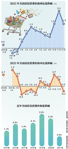 国家统计局公布的数据显示,去年12月,CPI同比上涨1.5%,涨幅比上月回落0.8个百分点;环比由上月上涨0.4%转为下降0.3%。食品价格仍然是影响CPI变动的主要因素。