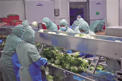 12月13日,大兴一蔬菜基地的加工车间流水线上,工人正在作业。
