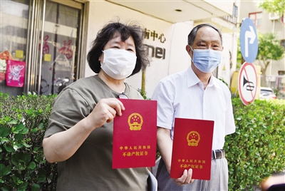 6月10日,海淀区科南中心,解决市民不动产登记难问题后,市民拿到了房产证。资料图片/新京报记者 王飞 摄