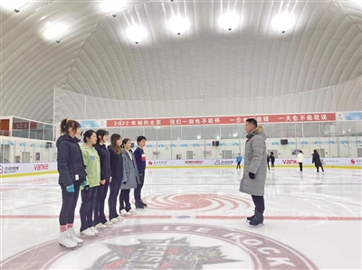 目前我以教学工作为主。我的学生在冬奥会参加志愿者活动、参加冬奥的相关演出,同时作为补冰员助力冬奥。平时我会给他们进行补冰工作的教学指导,教他们如何又快又稳地将被冰刀刮花了的冰面铺平。