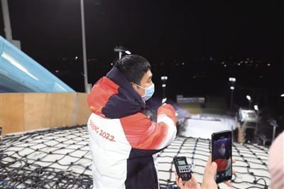 12月12日晚,工作人员在首钢滑雪大跳台的出发区介绍造雪情况。
