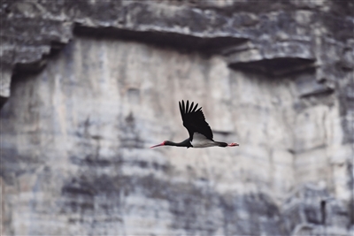 2020年11月30日,房山十渡镇四渡,一只飞翔的黑鹳。新京报记者 李木易 摄