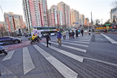 昨日,五道口路口。记者看到人行横道宽度已由6米拓宽到了8米。本版摄影/新京报记者 王贵彬