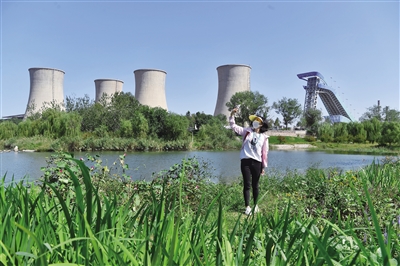 9月29日,北京冬奥公园,游客在滑雪大跳台、首钢高炉景观前自拍。资料图片/新京报记者 李木易 摄