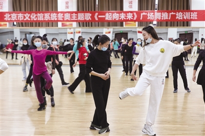 昨日13时许,随着“1234、2234”的节拍,以及“把手都牵起来,一起向未来”的冬奥主题曲伴奏,80位来自北京市各文化馆的舞蹈业务干部和舞蹈文化志愿者正在集体学习崭新编创出炉的《一起向未来》广场舞。