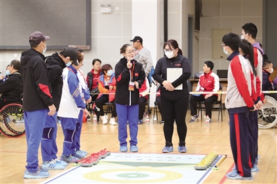 2020年10月,刘月媛(图中做手势者)在京冀蒙残疾人旱地冰壶邀请赛前做规则讲解、传达注意事项。受访者供图