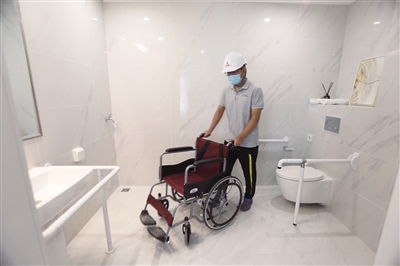 2020年9月12日,冬奥村运动员公寓样板间的卫生间内工作人员演示轮椅无障碍行驶新京报记者 王嘉宁 摄