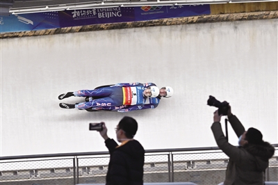 11月20日,美国组合格雷戈里奥/霍兰德在男子双人雪橇比赛中。当日,“相约北京”2021/2022国际雪橇联合会雪橇世界杯在国家雪车雪橇中心开赛。本版摄影/新华社记者 陈益宸