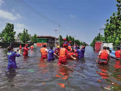7月27日,平谷蓝天救援队的队员们在卫辉转移被困群众。受访者供图