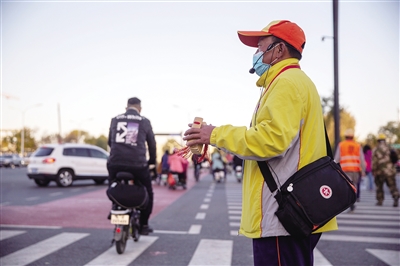 10月22日,石景山区古城路口,公共文明引导员为行人点赞。新京报记者 侯少卿 摄